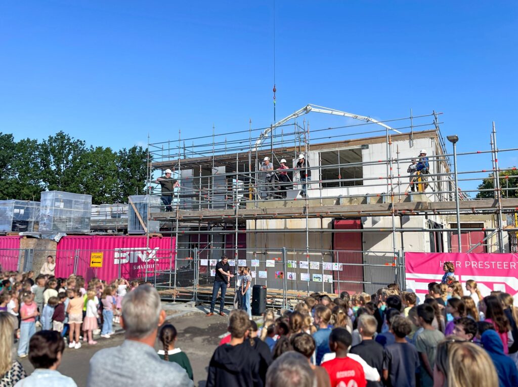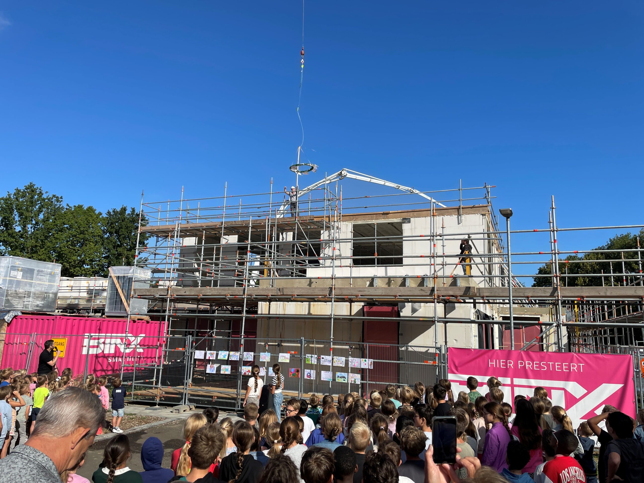 Vandaag was het een feestelijk moment in Amstenrade: het hoogste punt van de nieuwbouw is bereikt! Samen met de opdrachtgever, toekomstige gebruikers, adviseurs én de toekomstige leerlingen van de basisschool hebben we dit gevierd.
