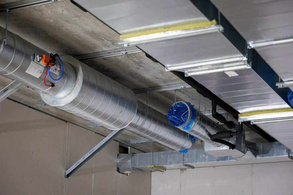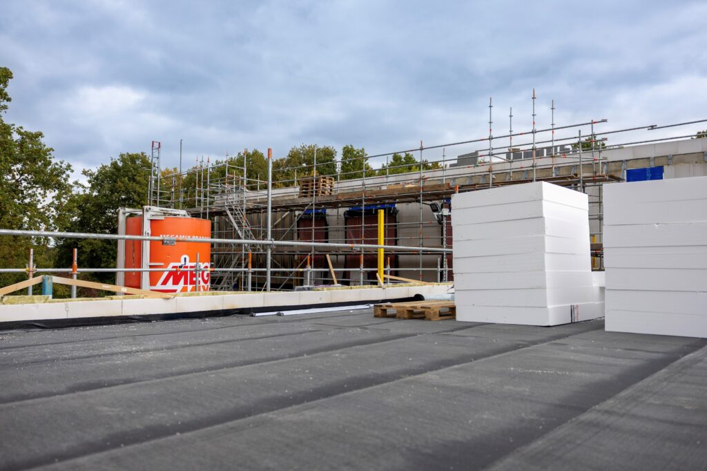 Binnen wordt hard gewerkt aan de installaties. Het luchtkanaalnetwerk is aangebracht, Albrand bv heeft de vloerverwarming gelegd en Haltronic Electro-Installaties B.V. is druk bezig met de elektra. In november worden de luchtbehandelingskast van AL-KO Luchttechniek BV en de warmtepomp van Climate Solutions Holland (CSH) BV geplaatst. Deze week starten de tegelzetter en stukadoor met de fijne afbouw.